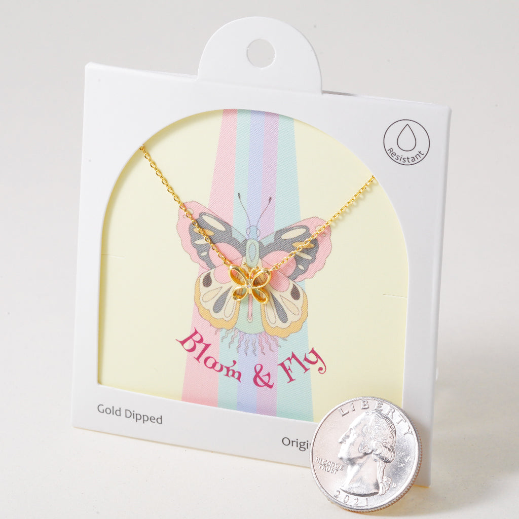 A gold-dipped necklace showcasing a colorful butterfly charm with layered wings and floral detailing. Perfect for adding a touch of whimsy and a whole lot of fab to any outfit.