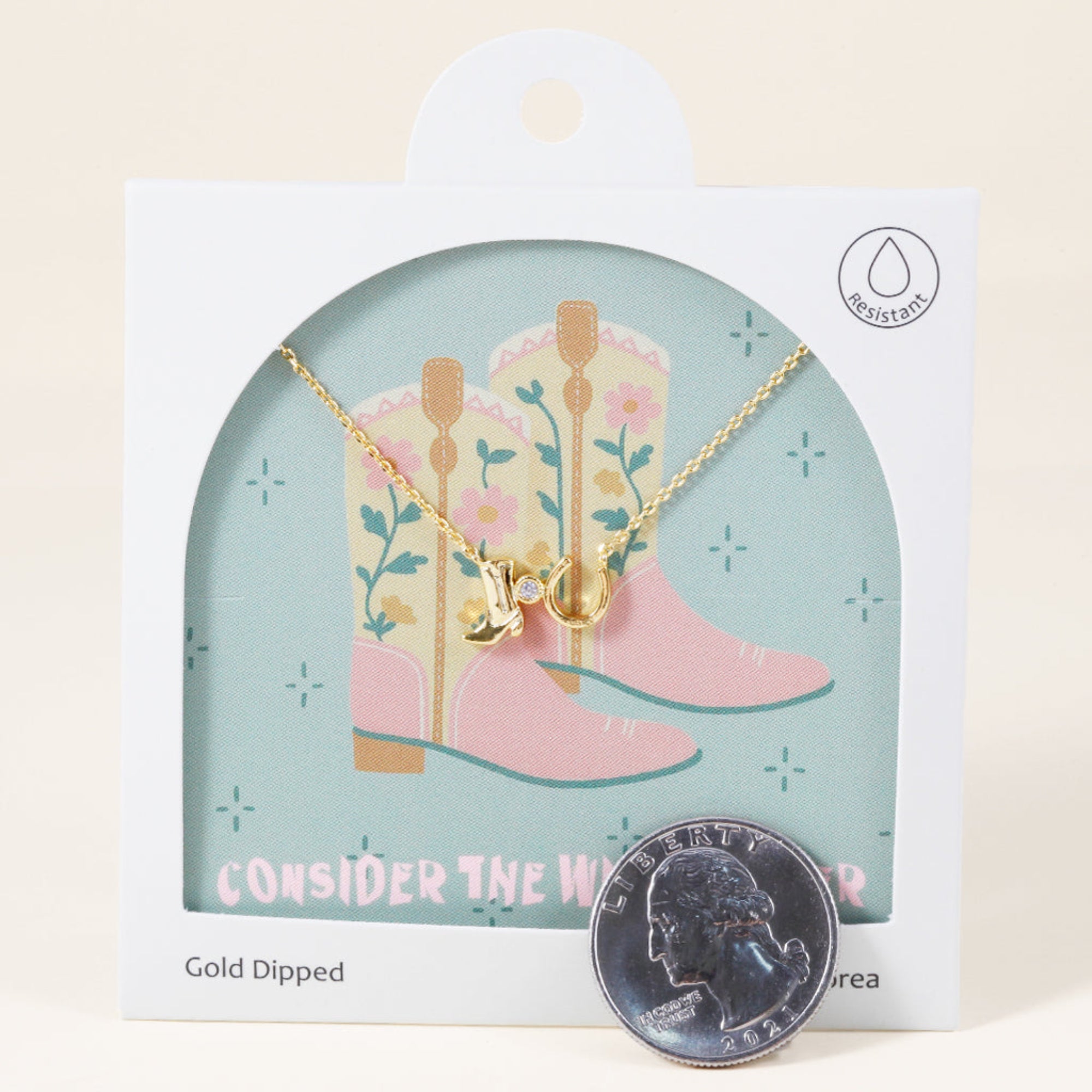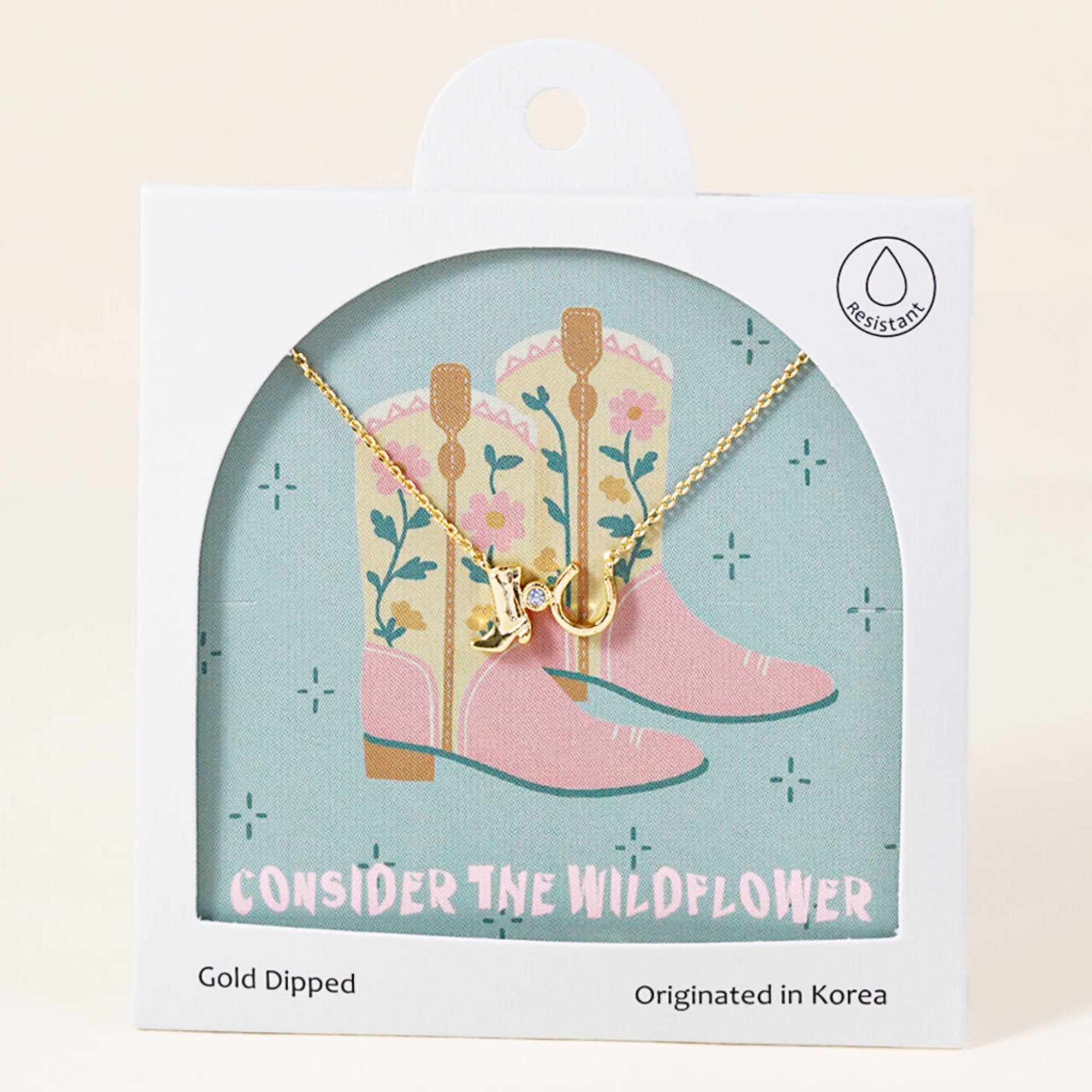 A little bit country, a little bit lucky — this dainty necklace features a charming cowboy boot and horseshoe duo, finished with a sparkling accent stone. Paired with the soft sage green card that reads “Consider the Wildflower,” this necklace celebrates individuality, strength, and free-spirited style. The perfect gift for wild hearts and western souls.