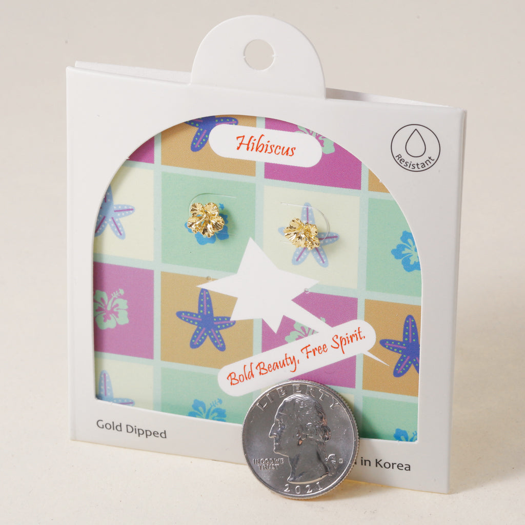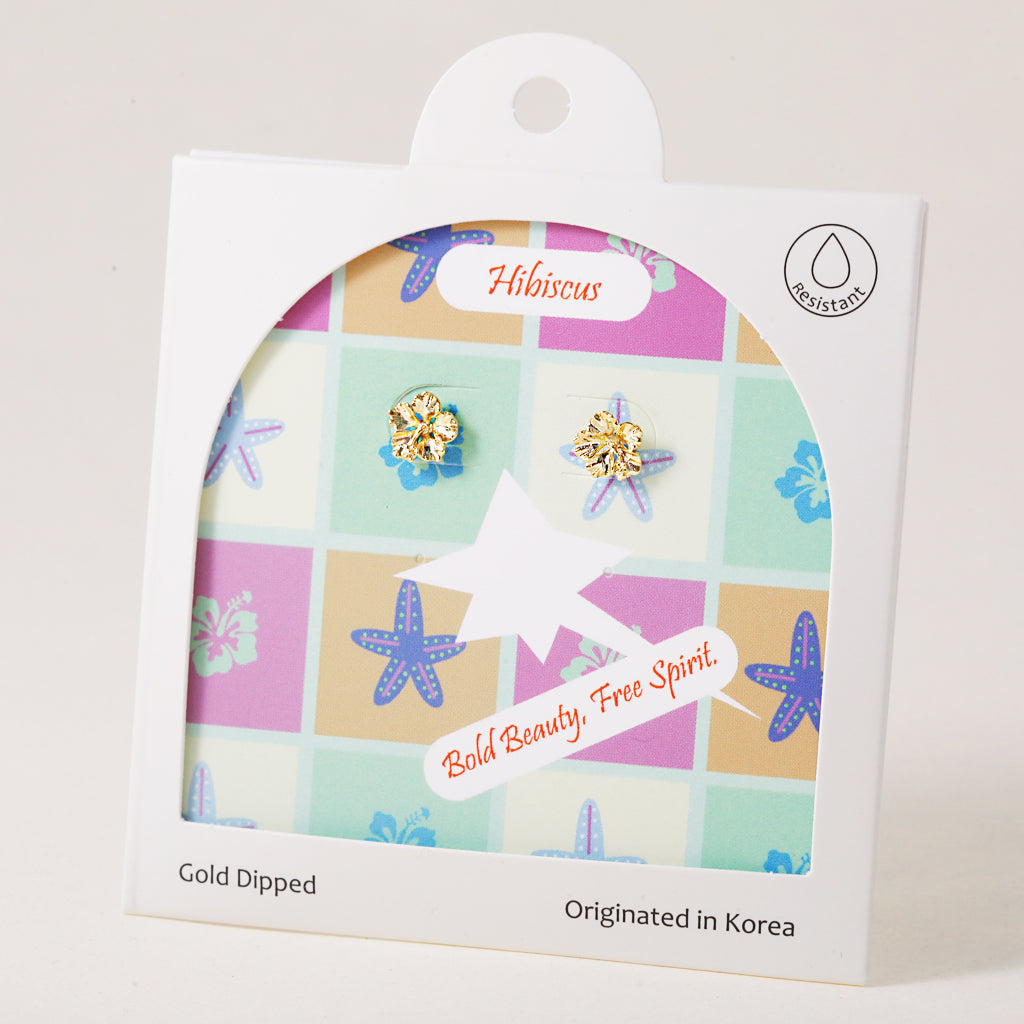 Transport yourself to a tropical paradise with this charming hibiscus flower studs. Evoking island vibes and laid-back days, this gold-dipped earring is a sweet and sunny accessory that brings a pop of color to any outfit.