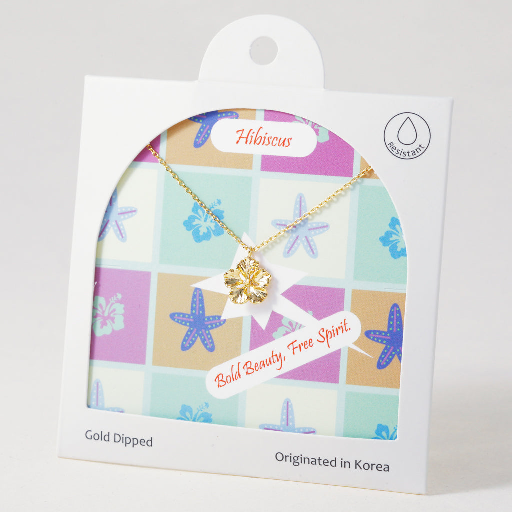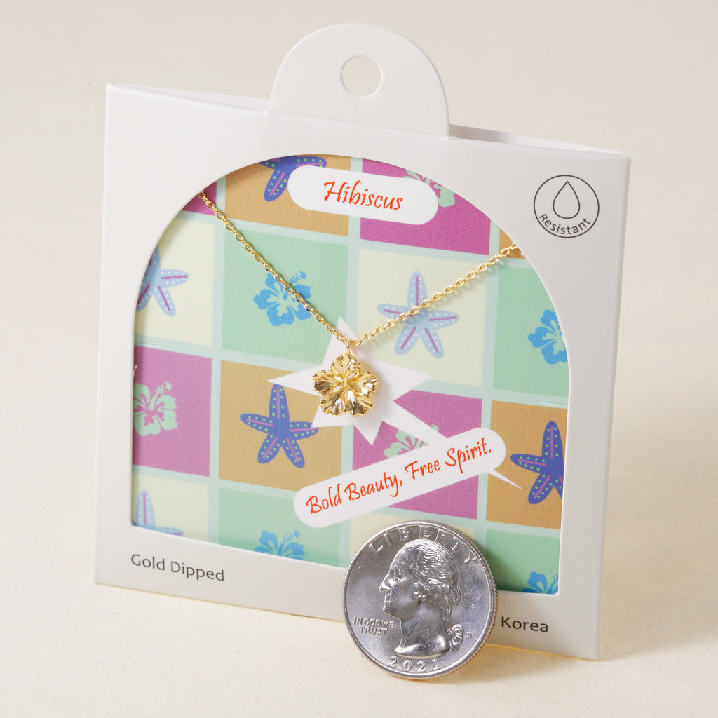 Transport yourself to a tropical paradise with this charming hibiscus flower pendant. Evoking island vibes and laid-back days, this gold-dipped necklace is a sweet and sunny accessory that brings a pop of color to any outfit.