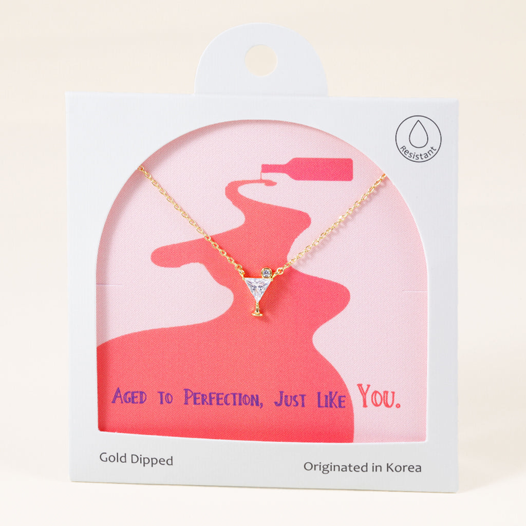 Raise a toast to timeless elegance with this martini glass pendant necklace, crafted carefully and accented by sparkling stones that mimic a fizzy cocktail. Paired with playful packaging that reads ""Aged to Perfection, Just Like You,"" it’s a perfect gift for birthdays, celebrations, or anyone who knows how to enjoy life with a little sparkle and style.