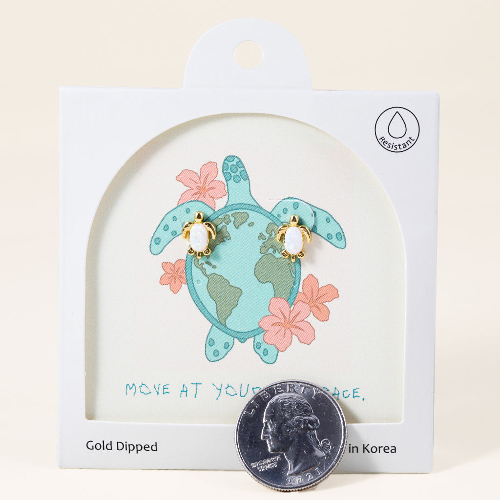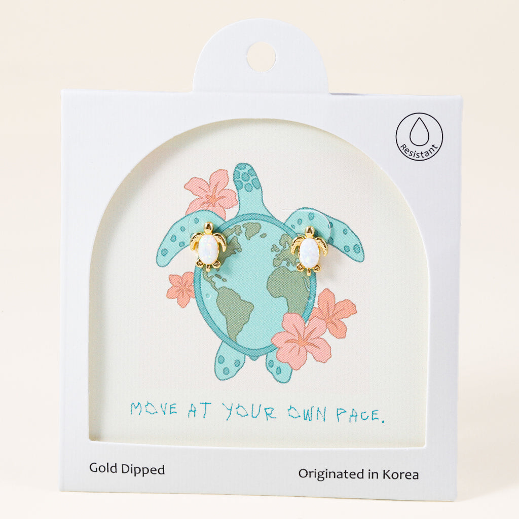 These adorable sea turtle stud earrings, featuring opals, are a gentle reminder to embrace your journey—one step (or paddle) at a time. Paired with the peaceful “Move at Your Own Pace” card featuring a globe-turtle illustration, this set is perfect for nature lovers, mindful souls, and anyone who thrives in their own rhythm.