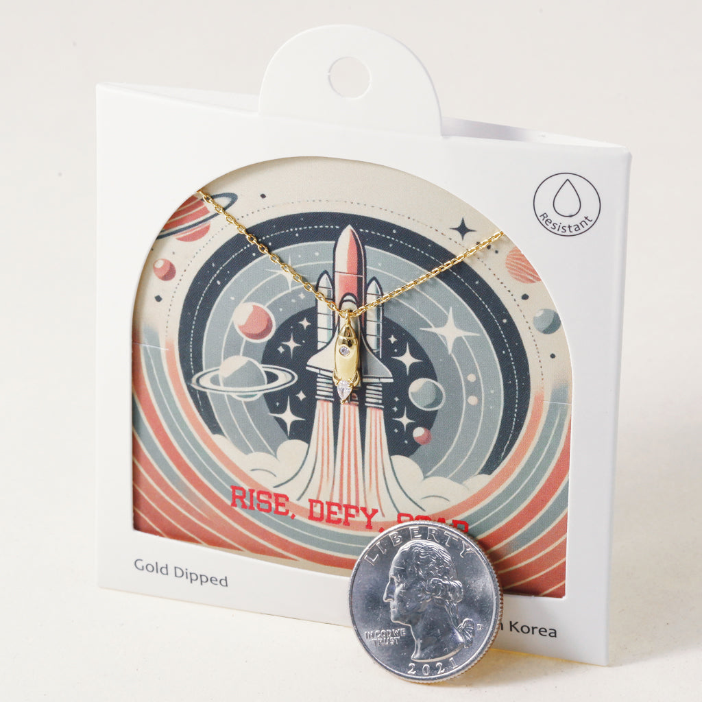 Blast off into endless possibilities with the Rise, Fly, Soar Rocket Necklace! Its retro-inspired design and bold gold-dipped rocket pendant is perfect for those with a cosmic soul. Perfect for adventurers and those who believe the sky’s the limit.