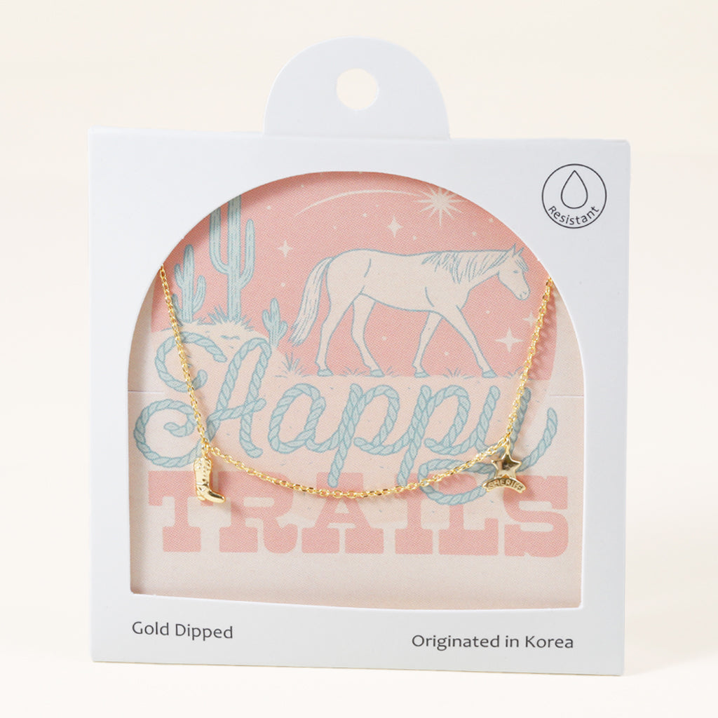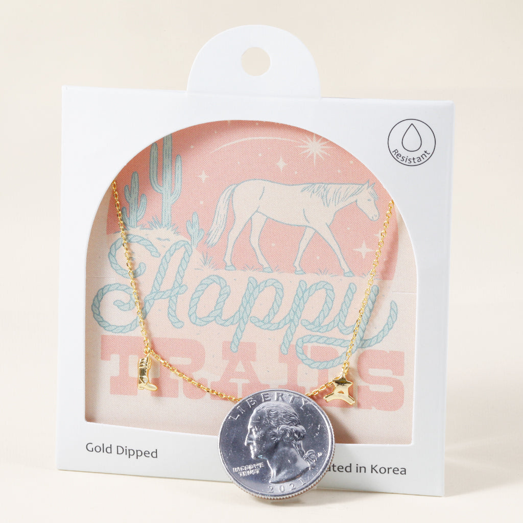 "Bring a little yeehaw to your everyday look with this Western Charm Necklace, featuring miniature pendants of a cowboy hat, boot, horseshoe, and star. Perfect for trendsetters with a wild spirit, this dainty yet bold piece captures the essence of rodeo style in a chic and wearable design. Whether you're hitting the trails or the city streets, it's always a good time for a little Western flair!"