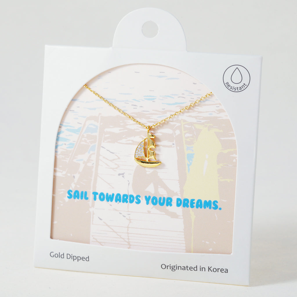 Chart your course with this delicate sailboat pendant, perfect for dreamers and explorers alike. Gold dipped and set against a soft pastel backdrop, it’s a sweet reminder to keep chasing your dreams—no matter the tides.